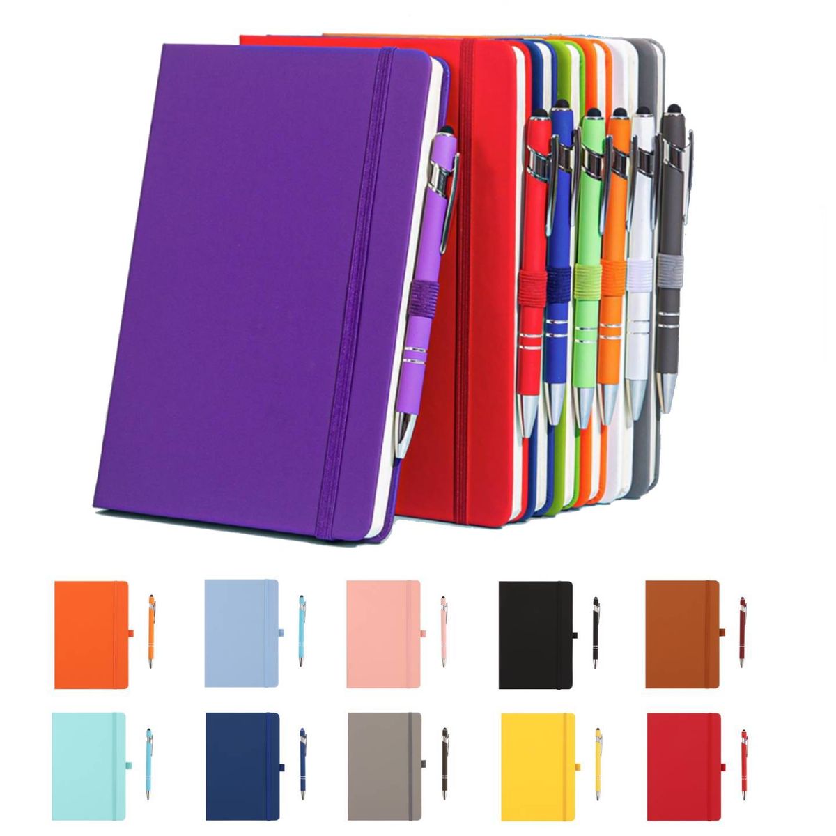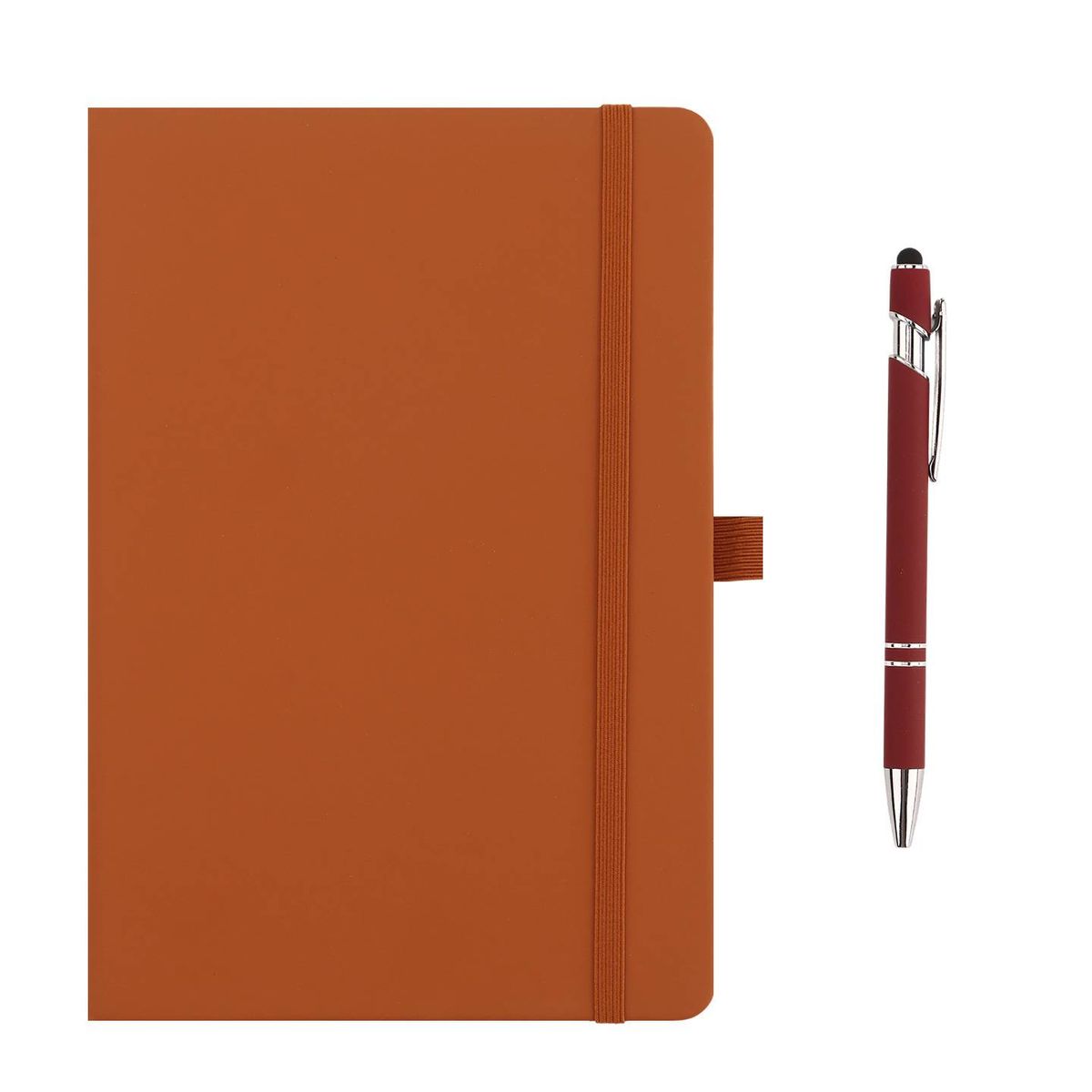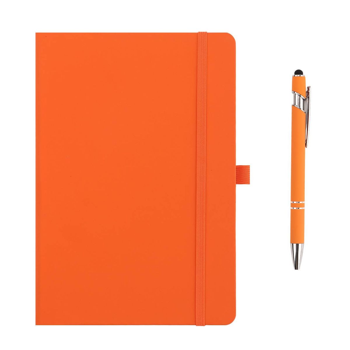 The journal & pen set features an A5 PU-cover notebook with 100 sheets of ruled paper, paired with a popular touch-screen stylus pen and a matching colored bookmark. PMS available for product color and imprint. Overseas production. Lower quantity available. Includes ocean freight delivered to NY.